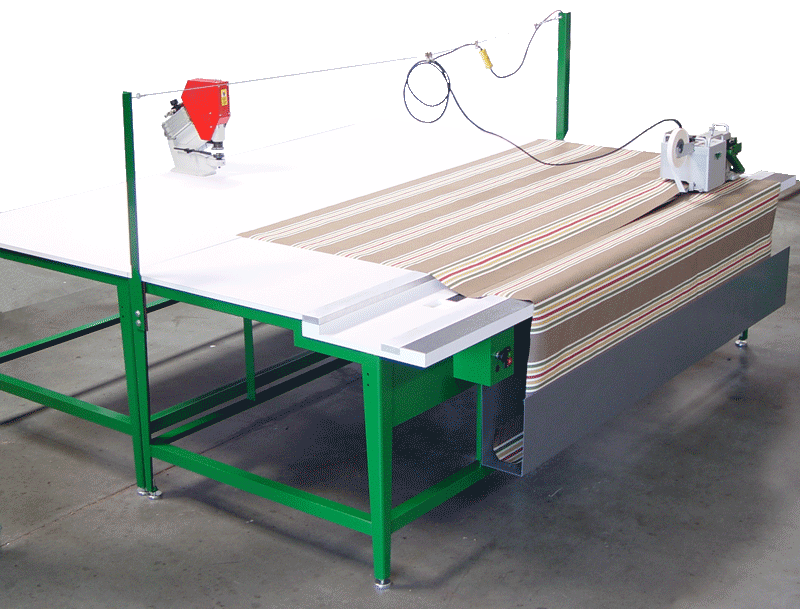 TRIAD mit Schmelzklebeeinrichtung bei der Markisenproduktion auf dem SINCLAIR Produktionstisch mit Vacuumfixierung und Führungsschiene.